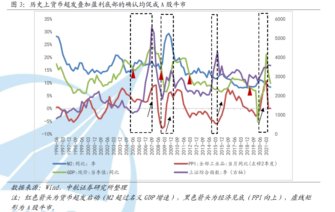 回顾A股历史,货币超发是交易热度提升以及波动率加大的前提条件,也是牛市的基础。我们认为权益资产的牛市需要两个条件的配合:货币的超发和企业盈利底部的确认。货币超发创造超额流动性,压低分母端提升估值;而经济底部对应企业盈利的底部,分子端见底回升。我们用M2增速与名义GDP增速差值刻画货币超发程度,用PPI作为企业整体利润增速的同步指标。历史数据显示每当货币超发指标向上,PPI见底,权益资产均出现了牛市。