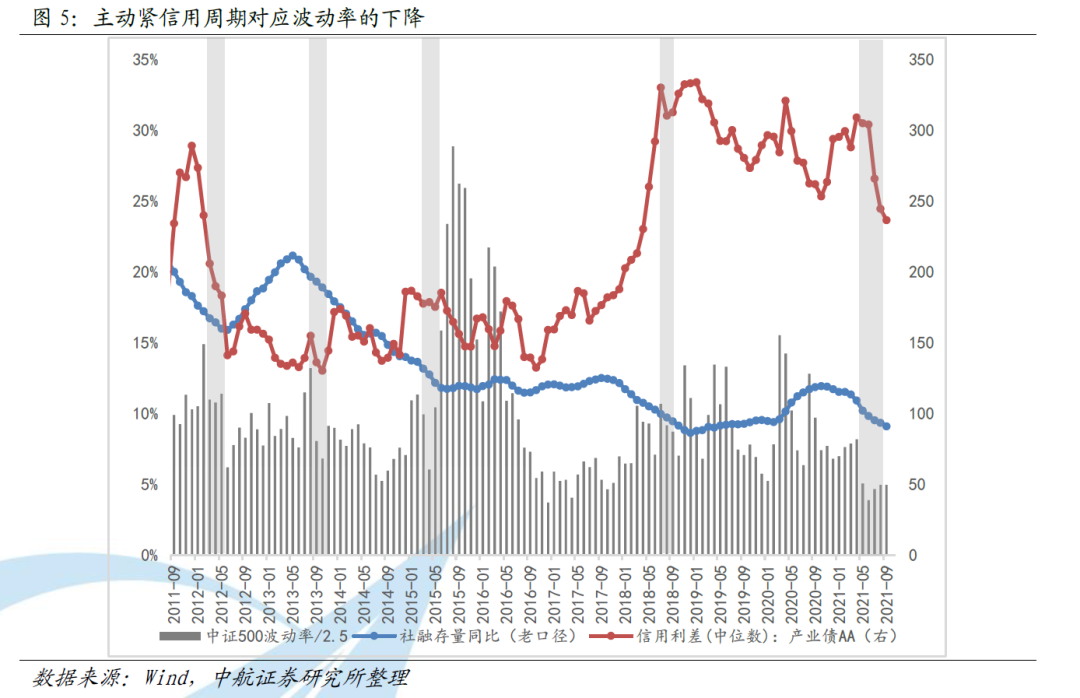 我们可以观测到,历史上主动紧信用时期,A股的波动率大概率都会下降(图5)。2021年以来A股波动率的下降部分原因是因为上半年中国进入了主动紧信用周期(社融同比与信用利差同步下降)。