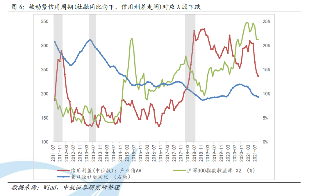 2018年是最典型的案例,经济下,政策紧。社融收缩,信用利差却快速抬升。金融机构向民营企业的融资萎缩,上市公司的股权质押爆仓此起彼伏,风险偏好急剧下降。在被动紧信用时期A股通常下跌。(图6)