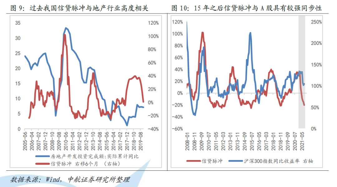“信贷脉冲”指标显示当前经济下行压力继续加大:“信贷脉冲”是广义信贷的二阶变量,我们用新增信贷规模占GDP比重的加速度衡量“信贷脉冲”,进而衡量当下的信贷情况。历史数据显示“信贷脉冲”对大类资产走势有较好的预测效果。在间接融资体系影响下,过去我国的信贷脉冲与地产行业高度相关,新增信贷大多流向房地产。近些年,随着房地产政策不断升级,信贷脉冲与房地产开发投资增速逐渐出现了脱钩(图9)。信贷脉冲与A股的共振也逐渐显性化(图10)。