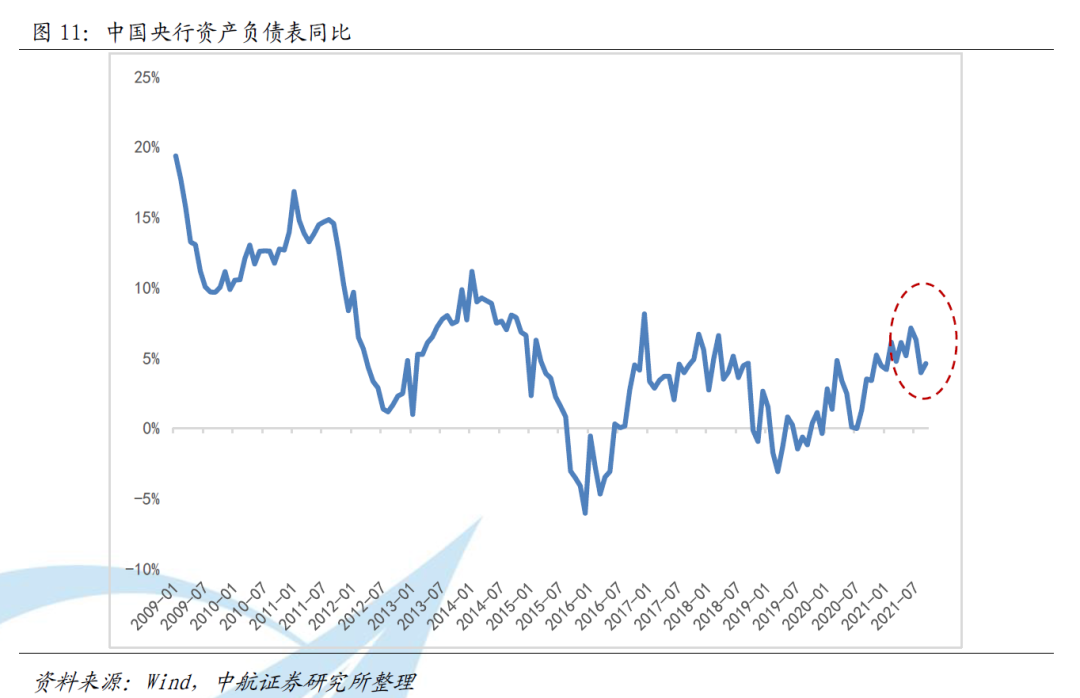 信贷脉冲自今年4月以来加速下降,信贷脉冲的走弱程度目前还未完全反应在指数层面上(图10)。中期经济下行压力较大。我国央行资产负债表同比增速已于今年6月出现拐点(图11),扩表速度已开始放缓。“稳增长压力不断显现,但政策维持定力”的情形类似于2018年,持续压制市场的风险偏好。