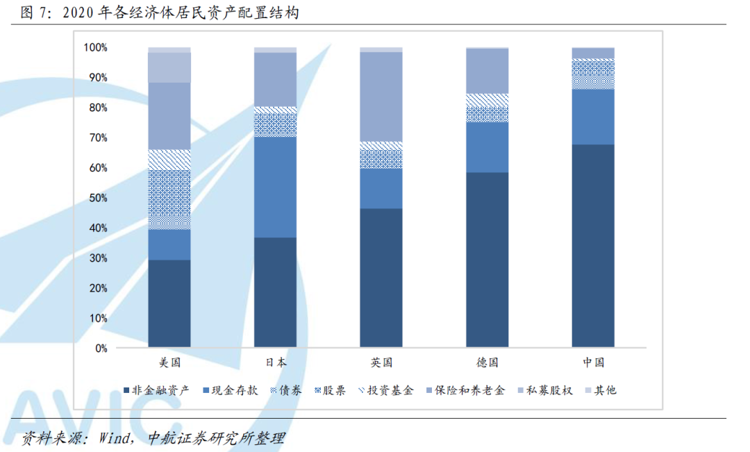 对比全球各经济体的居民资产分配,中国居民的财富主要集中在不动产等非金融资产,而风险权益类等金融资产的占比仍处于较低水平。