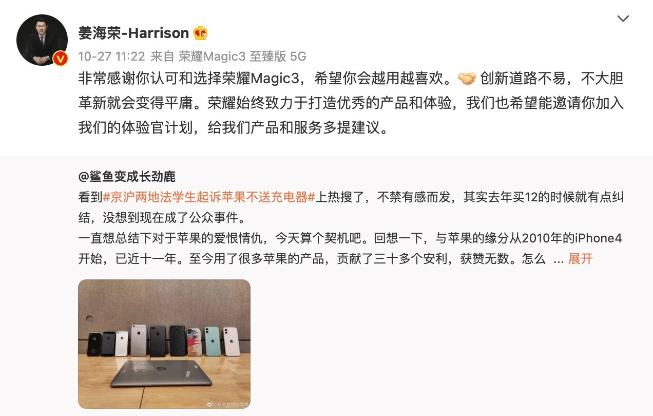 同时,结合之前荣耀CMO姜海荣在网上对资深果粉对于荣耀Magic3 Pro评价的回应,以及邀请其加入荣耀体验官计划一事来看,荣耀已经具备正面对标苹果的自信与实力。而作为中国5G移动端的领军企业,不管是现在是在影像创新,还是在续航、信号的打磨等方面,荣耀可以说和苹果平起平坐。