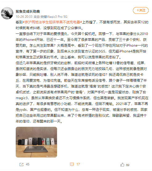 根据之前京沪两地法学院学生起诉苹果不配充电器以及资深果粉脱粉吐槽苹果创新能力匮乏、信号体验感不佳,而后入手荣耀Magic3 Pro,对国产手机创新的肯定来看,经过多年的技术沉淀和创新追赶,国产手机已经开始逐渐“破圈”手机技术难题,在技术方面具备了与苹果叫板的可能性。