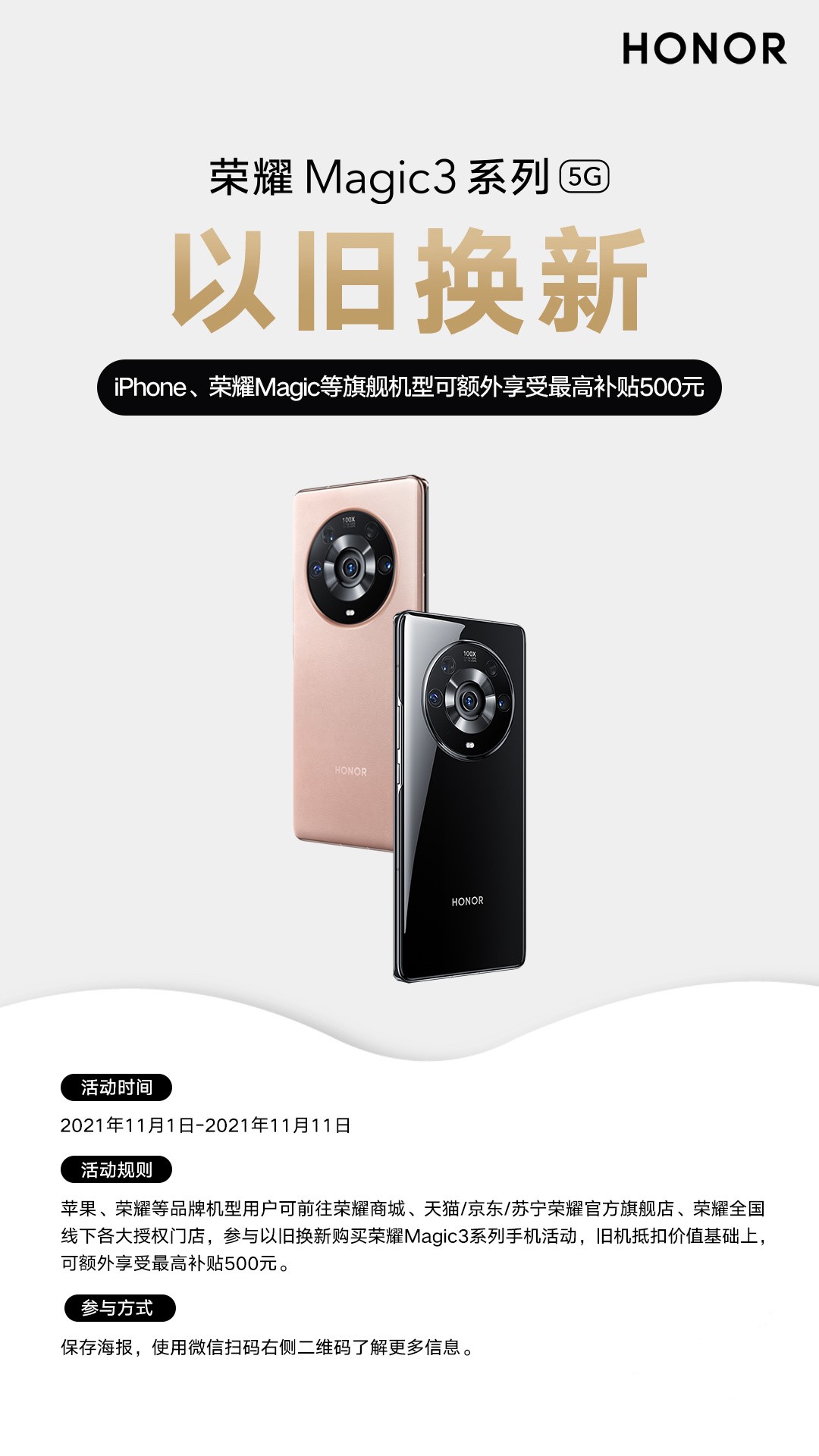 而关注双十一的朋友,或许已经感受到了这波战火的已经燃起。在荣耀新发布的双十一活动政策中,为让更多用户(果粉)来体验荣耀Magic3系列这款最新高端旗舰产品,荣耀特推出了以旧换新的活动,并且特别标注了iPhone、荣耀Magic等旗舰机型以旧换新可在旧手机抵扣价格基础上,再享受荣耀官方额外最高500元的补贴。业内不少人士在看到这一消息的时候,都敏锐的察觉到荣耀与苹果之间的高端市场角逐之战已经开启,同时也侧面反映了荣耀对标苹果的决心。