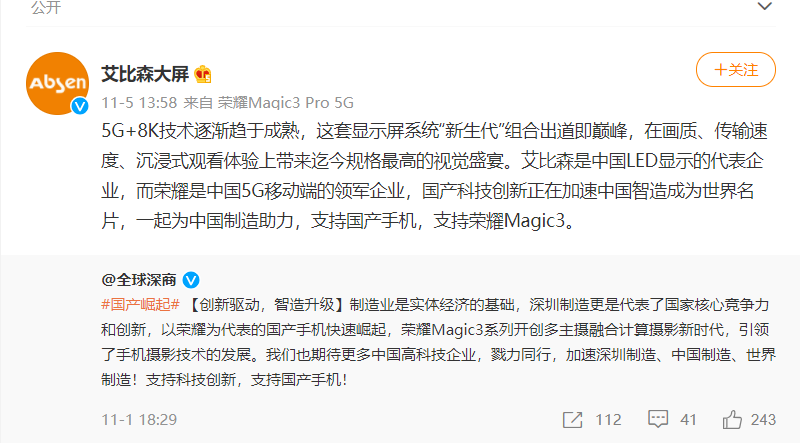 此前还有@全球深商 发微博号召支持国产技术创新,表示以荣耀为代表的国产手机快速崛起,荣耀Magic3系列开创了多主摄融合计算摄影新时代,正引领手机摄影技术向新的纪元迈进等,对荣耀Magic3的技术引领性给予了高度评价。同时,@艾比森大屏、@金蝶集团 也转发微博表示荣耀是中国5G移动端的领军企业,国产科技创新正在加速中国智造成为世界名片、荣耀手机在软硬件底层融合技术赛道上加速行业蝶变等,并呼吁国民支持国产手机,支持荣耀Magic3系列。