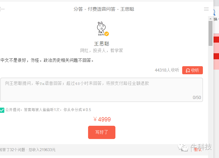 其次,分答平台已经出现成功案例。奇葩说第三季的热门选手、编剧鹦鹉史航长期霸占“才华榜”第一的位置,因为他在“分答”上赚钱最多。每个问题收费38元,截至5月28日下午,鹦鹉史航已经回答了1197个问题,总收入59160元。但是,这个“最赚钱”的宝座很可能被刚刚入驻的王思聪夺走,因为王思聪回答一个问题的收费4999元,截至6月2日下午,他只回答了32个问题,但总收入已经高达219633元。