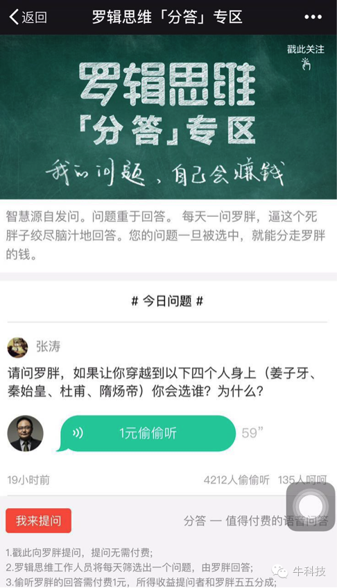 现在,在行推出“分答”栏目,进一步解放“约和被约”双方,为知识经验流通打开新的通道。相比在行,“分答”运营机制更轻,通过60秒短语音方式快速实现双方的“约会”。不仅如此,两者之外的人如果对提问有兴趣,还可以选择花1块钱“偷听”答案,提问者和答题者将共享这1块钱。