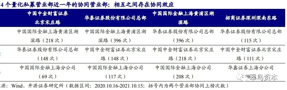 据开源证券研究发现,量化私募营业部之间相互协同次数较高,包括中国中金财富证券北京宋庄路、中国国际金融上海黄浦区湖滨路相互之间协同次数很高,进一步印证了它们很可能都是量化私募M的关联席位。同时,中国国际金融上海分公司也有较大概率是私募M的关联席位。