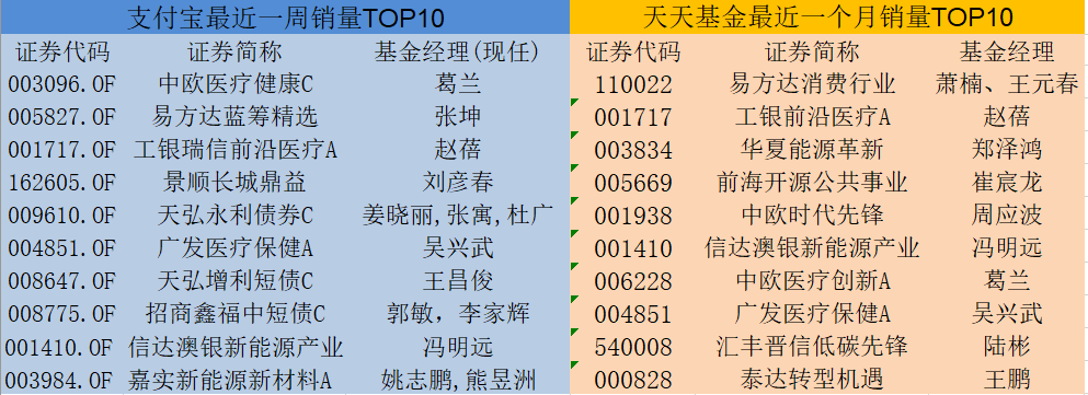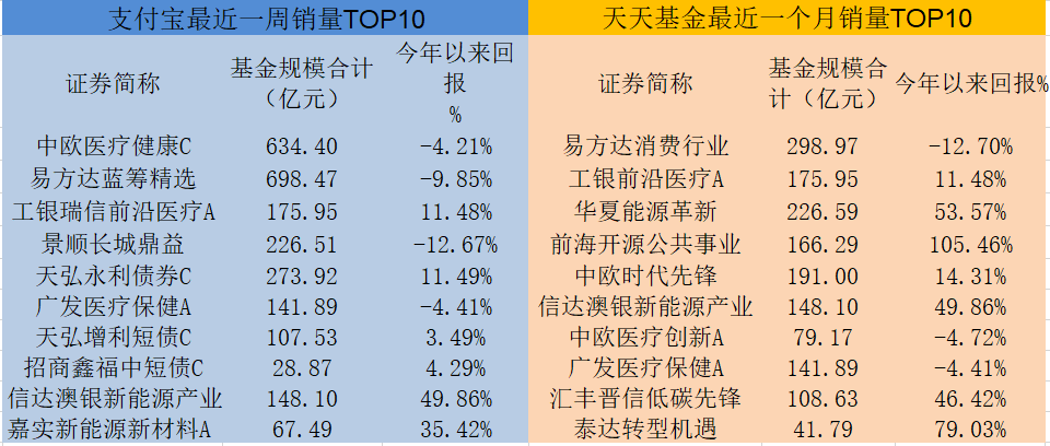 蚂蚁基金和天天基金公布的销量TOP10,或许可以让人一窥究竟。