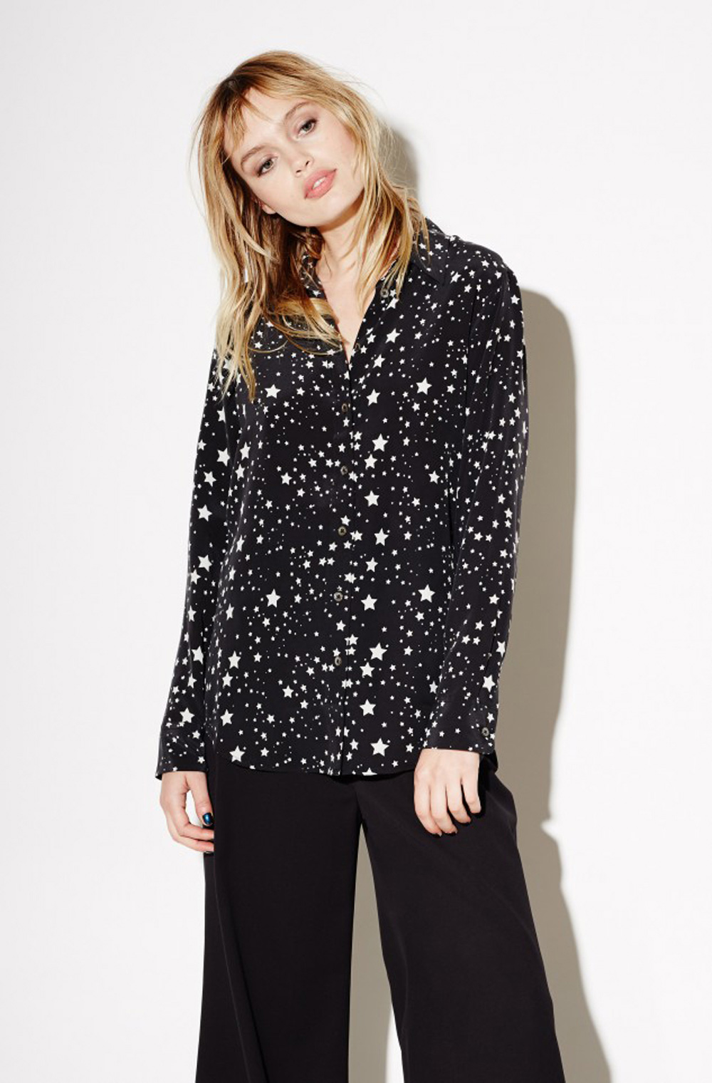 Kate Moss与Equipment推出了合作款,把Equipment以往独特的现代感中性轮廓、舒适面料以及有点睛之笔的细节设计,与超模Kate Moss的经典造型相结合。领结系带、摇滚短毛衫、星星豹纹元素、经典的几何图案,还有Kate Moss红、黑、白、灰的标志性色调,这样的设计把摇滚和休闲时尚融合得让人想纳入衣柜。系列从6月2日起首先在NET-A-PORTER独家销售两周,6月15日起对其他零售商开放。