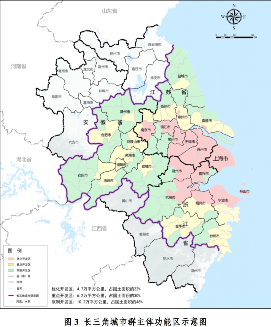 其中,上海、苏南、环杭州湾等地被列为优化开发区域,《规划》要求要率先转变空间开发模式,严格控制新增建设用地规模和开发强度,适度扩大农业和生态空间。优化开发区共4.7万平方公里,占规划国土面积的22%。