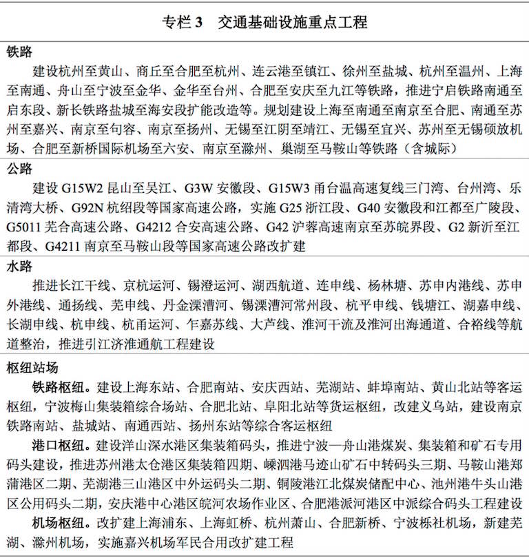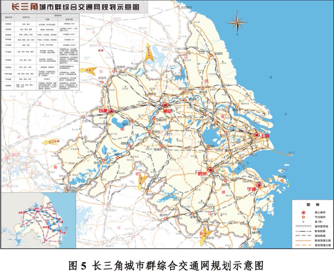 在交通上,《规划》要求依托国家综合运输大通道,以上海为核心,南京、杭州、合肥为副中心,以高速铁路、城际铁路、高速 公路和长江黄金水道为主通道的多层次综合交通网络。