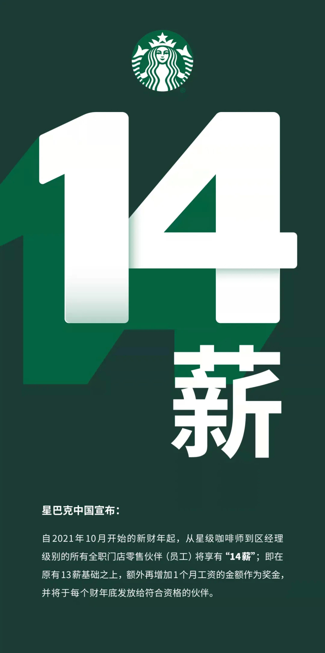 刚刚,星巴克中国宣布,自2021年10月开始,所有星巴克中国的全职门店零售员工,都将首次享有“14薪”;即在原有13薪基础之上,额外再增加1个月工资的金额作为奖金,并将于每个财年底发放给符合资格的员工。