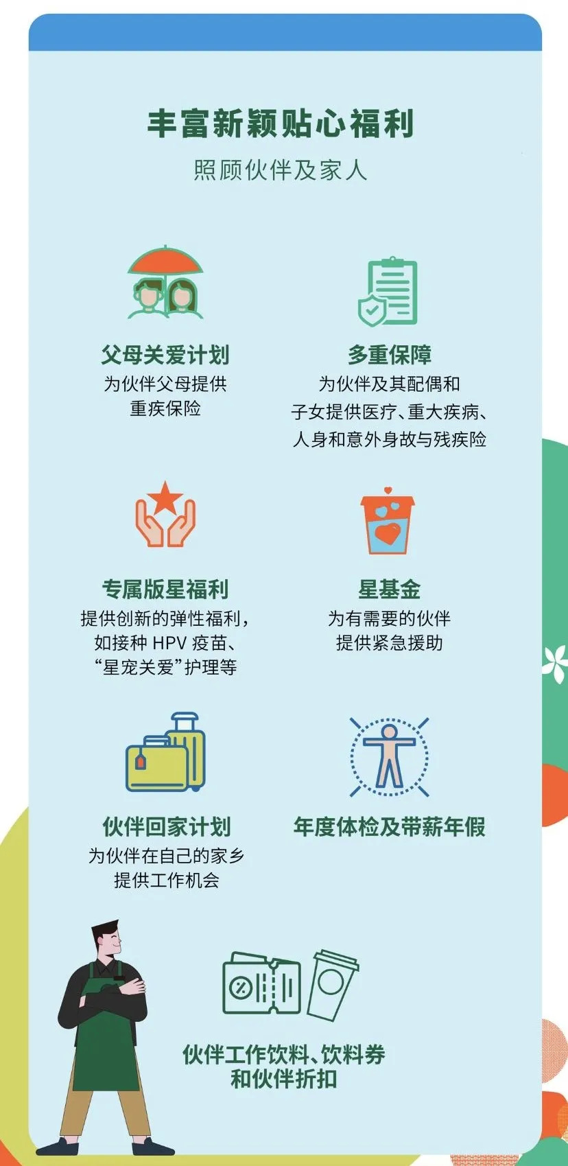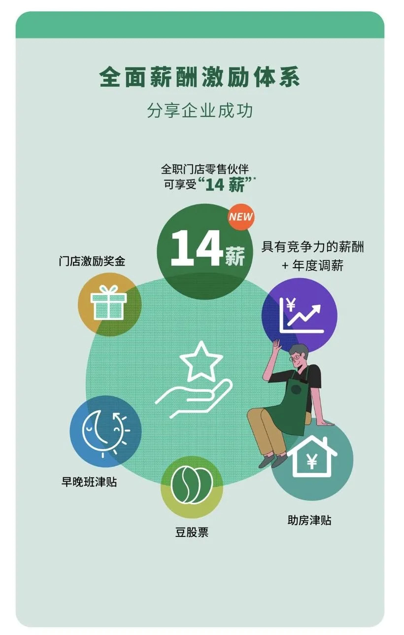 除“14薪”以外,星巴克中国也持续加大了其他福利的投资力度,对现有的伙伴福利进行了大幅升级,包括:有竞争力的年度绩效调薪;更优化的早晚班津贴;在部分城市升级“助房津贴”额度;鼓励伙伴到不同城市体验的“伙伴识天下”计划等等。