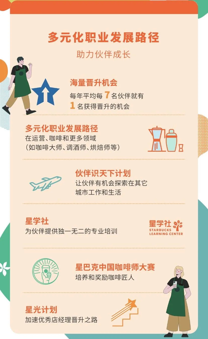 小食代今天了解到,星巴克中国每年平均每7名员工就有1名获得晋升机会。该公司曾透露,其平均每15小时晋升一位新的门店经理,每周晋升一位新的区经理,每季度晋升一位新的区域总监。
