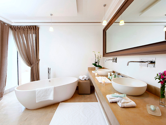 这里的套房和别墅都带有户外的私人花园和独立泳池,设计呈现出介于阿拉伯与欧洲宫殿之间的豪华风格。秀美的花园和池塘围绕四周,清风徐徐的别墅和套房营造出奢侈的私人空间。房间内还设有恒温泳池和按摩浴缸,外观和舒适度兼得。