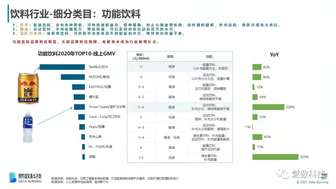 据燃数科技数据显示,2020年功能饮料线上成交总额前三位分别是红牛、脉动及东鹏,电商销售市场整体品牌效应明显,头部品牌地位稳固。电解质水以224%的增长率成为行业新增长点。