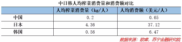 根据欧睿数据,中国榨菜行业销量从2008年的48万吨增加到2019年的66.88亿吨,市场规模不断增加。不过对比亚洲邻国饮食习惯相近的日本和韩国,国内人均榨菜消费量仅为0.2kg/人,而日本和韩国为4.36kg/人和0.56/人;而在人均消费额上,我国为0.65美元/人,日韩为37.12美元/人和6.47美元/人,差距颇为明显。这也暗示着未来市场增长潜力巨大。