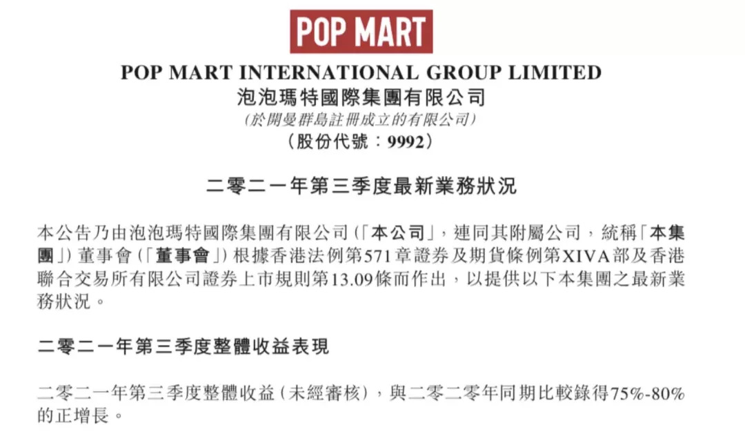 根据泡泡玛特的招股书数据,其2020年第三季度的总营收约为7.27亿元。如果按此计算,则泡泡玛特在2021年第三季度的总营收约为13亿元左右。