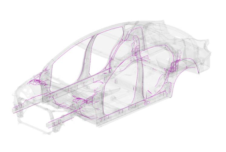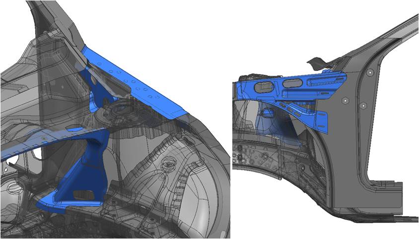 在经过MDO复杂的拓扑优化之后,结构工程师还“翻译”拓扑工具的语言并转化为设计。没错,仿真软件不能代表一切,我们仍需要优秀的工程师。迈锐宝XL车身设计团队根据优化研究结论更新设计,通过动态模拟分析创建新的结构载荷路径,比如通过前减震塔的龙门架结构,减轻了动力传动引发的转向管柱和座椅骨架振动,带来的是实实在在的NVH性能提升。