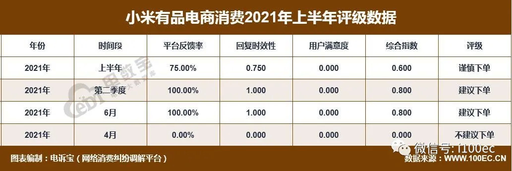 不过小米有品快速发展的背后,也存在用户体验问题。据“电诉宝”显示,2021年上半年“小米有品”共获得4次消费评级,其中1次获“谨慎下单”;2次获“建议下单”;1次获“不建议下单”,2021年上半年整体消费评级为“谨慎下单”。