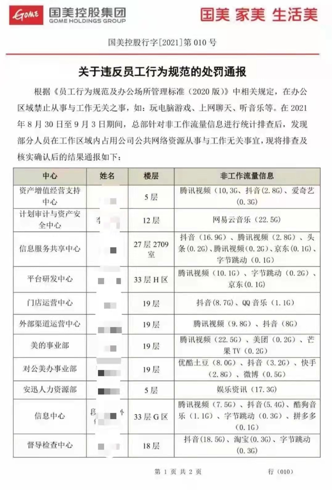 这份通报显示,在2021年8月30日至9月3日期间,国美总部针对非工作流量信息进行统计排查后,发现部分人员在工作区域内占用公司公共网络资源从事与工作无关事宜,如玩电脑游戏、上网聊天、听音乐等。根据公司规定,对11名员工(包括一名外包人员)进行了通报和处罚。