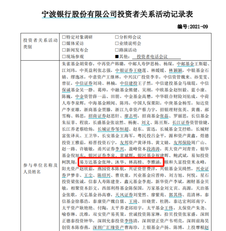 而总市值高达2200亿元的宁波银行,则在本月中旬密集接待了三场机构调研。其中,11月10日、16日举办的两次电话会议中,均出现了张坤的身影。11月10日举办的电话会议上,参与调研的机构多达近百家;而16日参与调研的机构仅有国信证券和易方达基金两家,除了张坤之外,易方达基金的李涵雅、沐华、汪玲、李昭函、杜才鸣、郭杰、林高榜也出现在调研名单中。