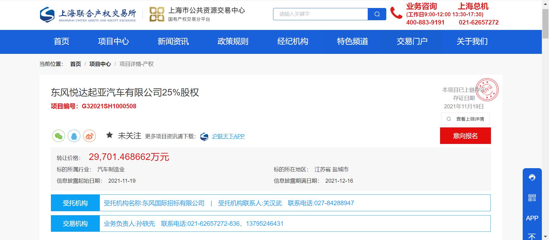 11月22日,据上海联合产权交易所网站显示,东风汽车集团已正式挂牌出售旗下三方合资公司——东风悦达起亚汽车有限公司25%股权。