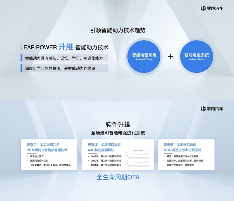 同时,在本届车展上,零跑汽车还正式发布旗下LEAP POWER“升维”智能动力技术,其由智能电驱和智能电池两大系统组成,可使电驱系统全生命周期OTA升级。