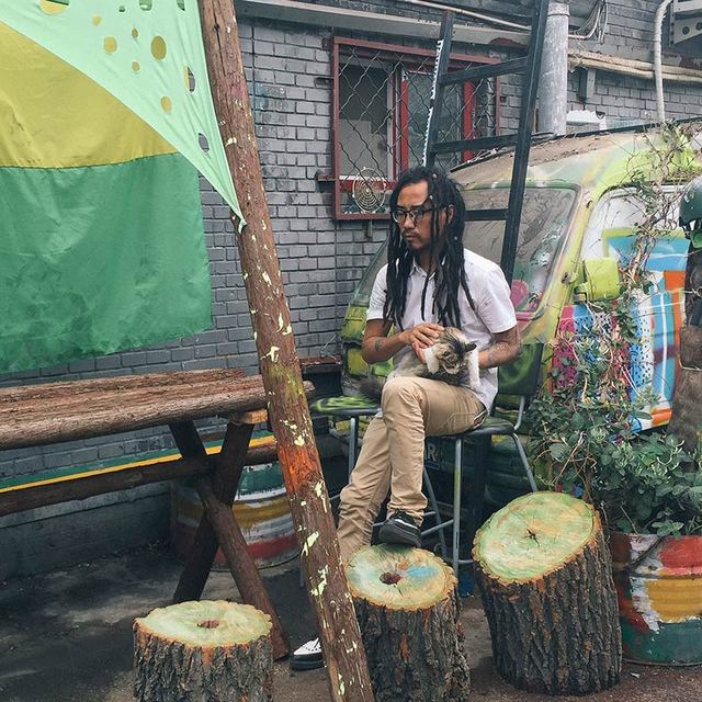 我很喜欢T7,这里可以随意抽烟,音乐很放松,你可以跟任何人聊天,如果你自己发会儿呆,也没人来打扰。店内的窗用了许多神奇的单向透视玻璃。有时,我们一起看着窗外化浓妆的年轻女孩在彩色大巴前拍照,搔首弄姿,强行捉来路过的猫当道具。这只猫是T7收养的第七只流浪猫,叫小七。它刚当了妈妈,脾气很差,扭腰就是一爪。