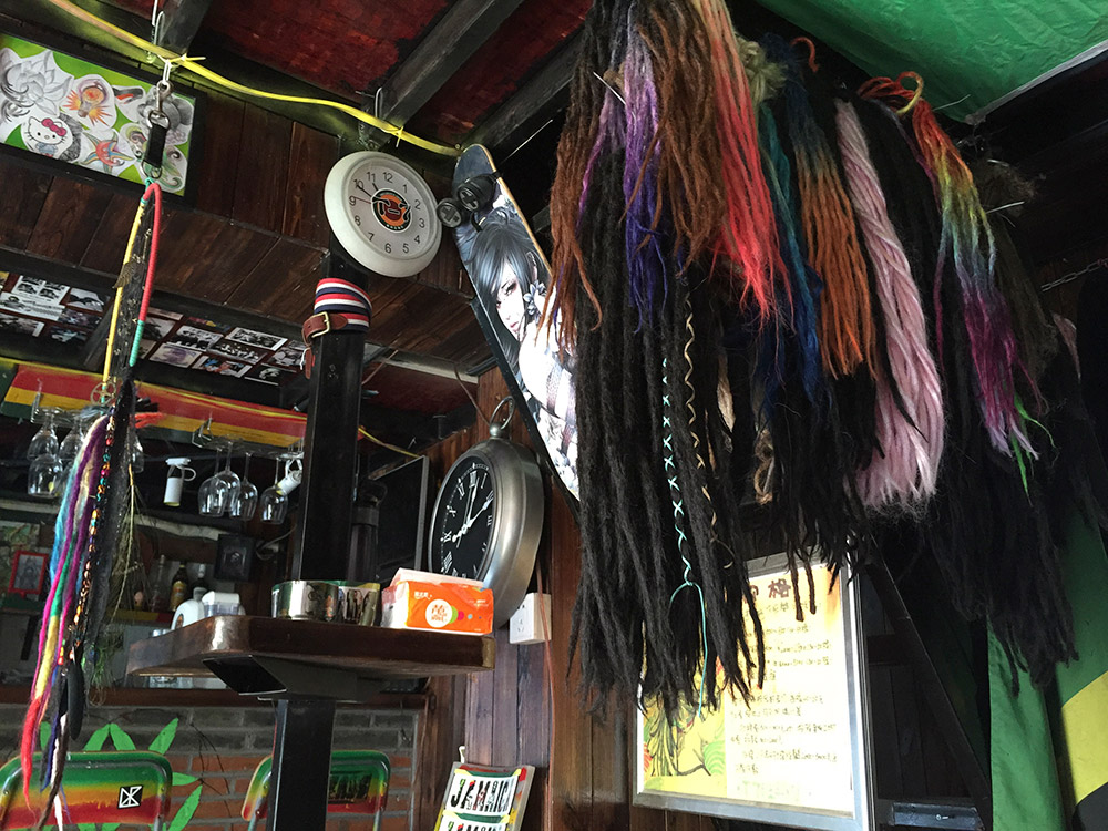 T7是一间酒吧,也是一家脏辫店,门脸很小,颜色鲜艳,是斑斓夺目的非洲风格。小木门里传出节奏分明的雷鬼乐。屋子里昏暗狭小,墙上、窗沿挂着粗细和颜色不一的纤维辫子,一大束一大束,都是老板亲手勾成的。