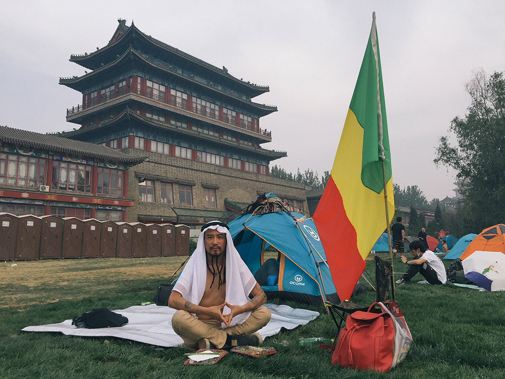 午后是一天最热的时候,各舞台演出陆续开始,人们从帐篷里钻出来,往演出场地走去。杨小鹏的白帐篷边插着一面红黄绿三色旗,也就是牙买加国旗。这是营地中距演出场地最远的开阔角落,有些冷清。他打赤膊,头上披下一大块白色的阿拉伯头巾,用黑色的粗发圈固定。