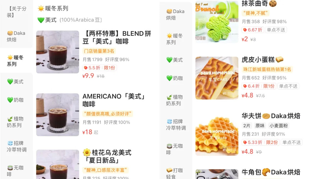 打咖的菜单分类非常清晰全面,产品系列包括美式、奶咖、冷萃特调、乌龙奶茶、手冲等,菜单上还有烘焙、零食铺、无咖啡、植物奶、暖冬系列等附加分类。