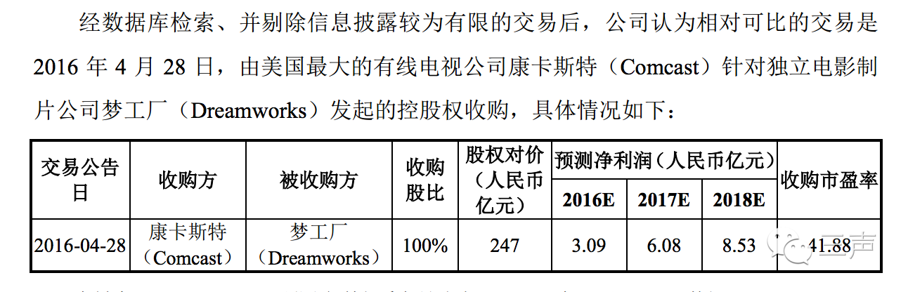 在深交所关心的万达影视估值和传奇影业未来盈利预测问题上,万达院线表示,收购万达影视的市盈率为22倍,低于2016年4月美国康卡斯特收购梦工厂平均41.88倍的市盈率,因此对万达影视的收购估值具备合理性。