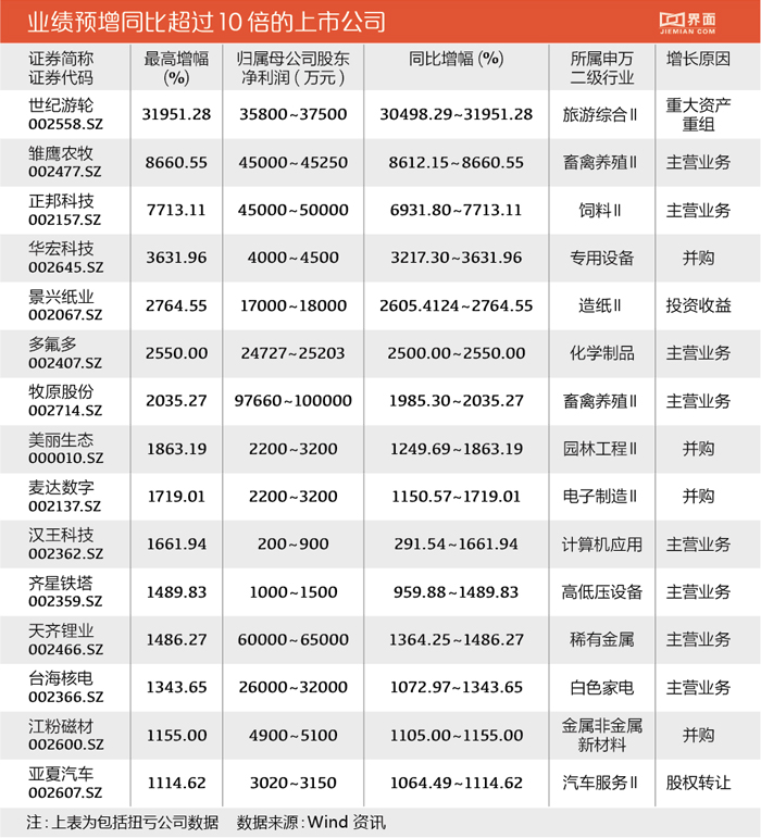 界面新闻根据预告净利润最大变动幅度为参考指标,业绩预增同比超过10倍的上市公司如下表所示: