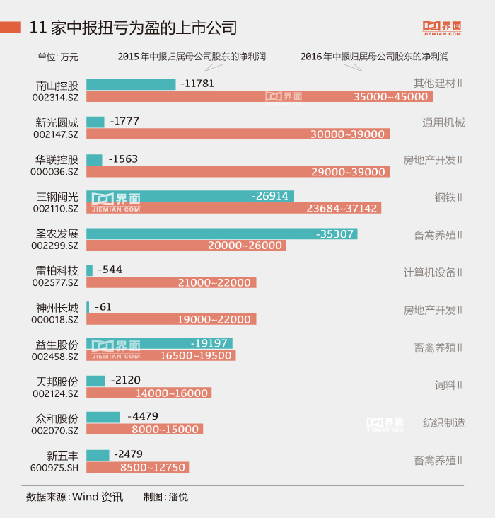 除此之外,中报扭亏为盈且2016年归属于母公司股东净利润超过1亿元的11家的上市公司中,南山控股(002314.SZ)、新光圆成(002147.SZ)、华联控股(000036.SZ)以及三钢闽光(002110.SZ)实现净利润的最高值均超过了3亿元,分别为4.5亿元、3.9亿元、3.9亿元以及3.71亿元。南山控股主要是由于本期结转房地产项目产品利润率较上期高所致;新光圆成则是受益于重大资产重组;华联控股与上述提到的景兴纸业一样,受益于卖出上市公司股票取得的投资收益;而三钢闽光主要是得益于2016年钢价的回暖。