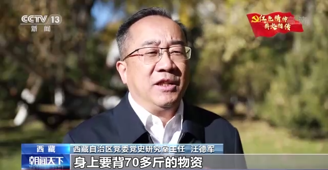 西藏自治区党委党史研究室主任 汪德军:进藏部队每一个干部战士身上要背70多斤的物资,徒步走进西藏。在翻越西藏大山大河过程中,干部战士克服了重重困难,一路为西藏老百姓看病送药,让我们西藏老百姓首先认识了解放军,认识了共产党。