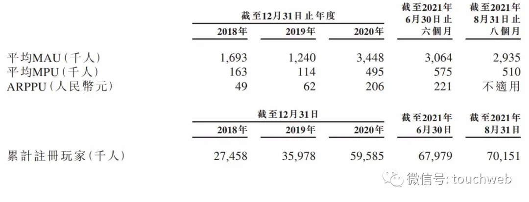 截至2021年6月30日,青瓷游戏的累计注册玩家超过7000万,平均MAU为306万人,平均MPU为57.5万人,ARPPU为221元。