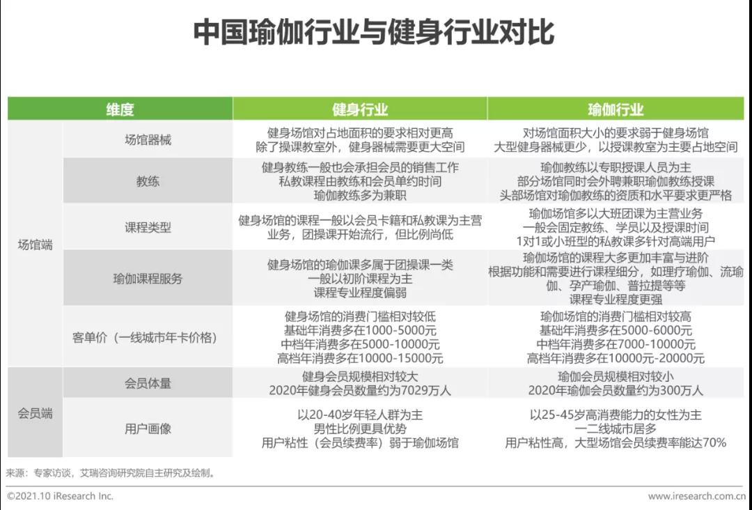 相比健身行业,瑜伽行业客单价更高、对教练资质和课程服务水平的要求更高、用户规模更小、用户粘性更强