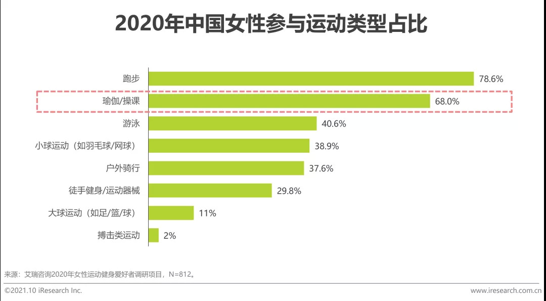 收入水平的提升和生活方式的升级改变了女性群体的消费偏好。据智联招聘《2021年中国女性职场现状调查报告》数据显示,当前中国职场女性收入较男性的差距同比收窄。随着收入的提高,女性消费者越来越注重生活品质的提升,女性消费力正在不断崛起,“她经济”时代来临。据2020年艾瑞咨询一次女性运动健身数据显示,2020年超六成女性运动健身爱好者参与过瑜伽习练,由于女性消费者在消费动机和产品选择上更注重“自我表达”与“分享”,因此极大程度推动了瑜伽习练的风潮。