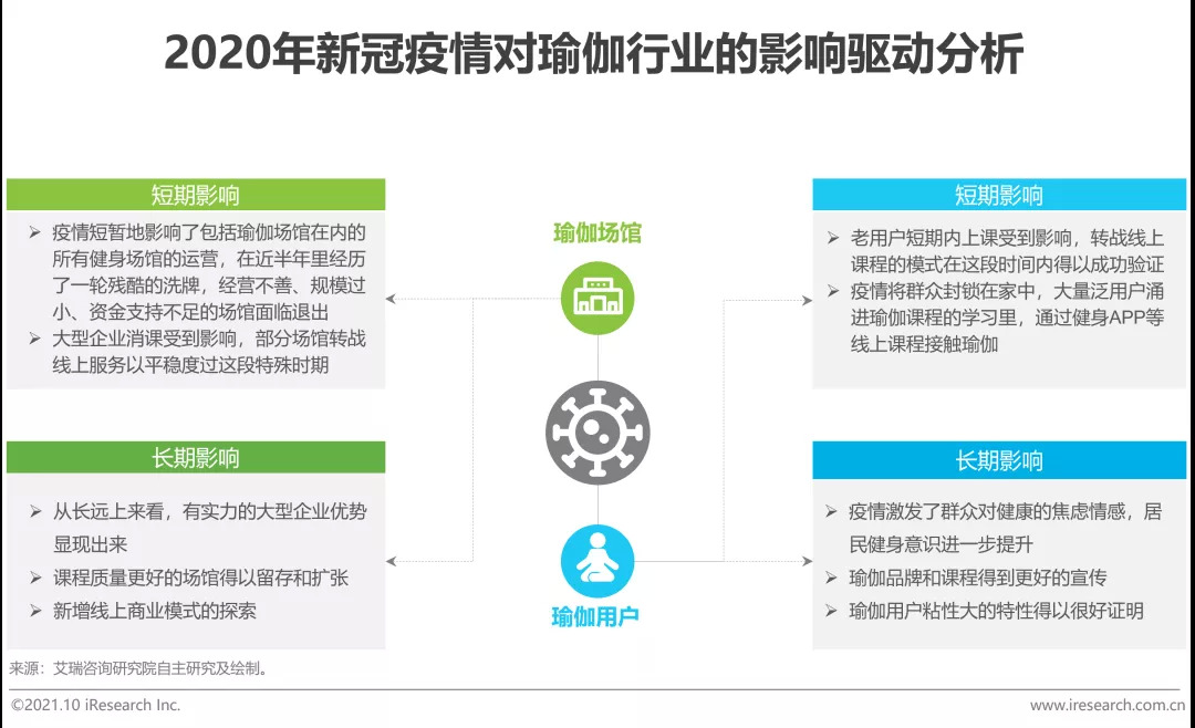 2020年初全国新冠疫情爆发,从短期来看,以线下团课为主营形式的瑜伽服务受到严重波及,不同地区的瑜伽场馆被迫进入2至6个月不等的业务暂停期;部分经营不善、规模过小、资金支持不足的场馆受限于成本压力而不得不退出市场,导致2020年瑜伽行业规模有所萎缩。但从长期来看,综合实力较强、具备多元化变现方式的大型连锁瑜伽企业得以留存,并可择机逆势扩张,更好的课程质量以及更全面的线上商业模式探索,有利于整个供给端的良性发展。同时,在疫情影响下,城市居民的健康意识得到进一步提升,用户对包括瑜伽在内的健身服务关注度提升,瑜伽品牌和课程得到更好地宣传。