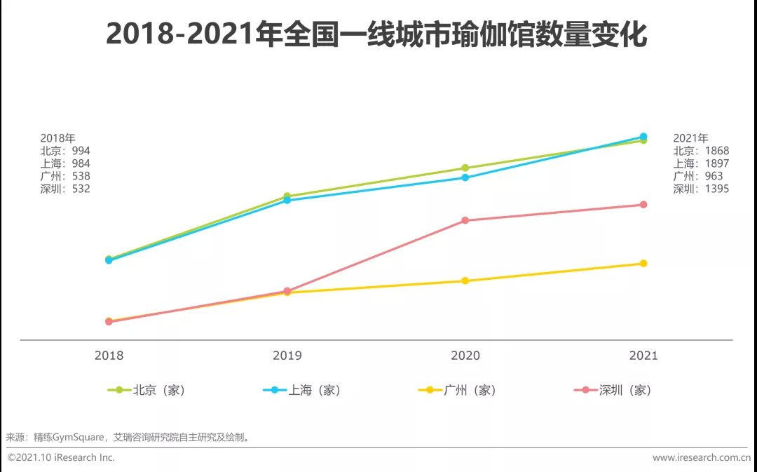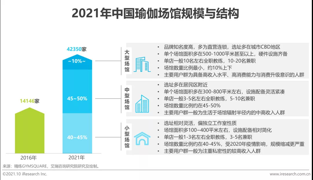 2021年瑜伽场馆达四万家以上,中小型场馆数量占比九成
