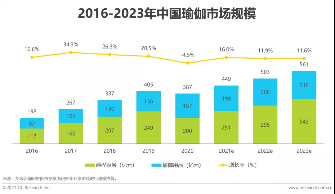 2020年,受疫情影响,中国瑜伽行业市场规模为387亿。未来,随着用户群体健康意识的提升以及瑜伽服务与理念的进一步普及,在课程与服务的价值驱动下,中国瑜伽行业将继续稳步发展,预计2023年市场规模将超500亿。