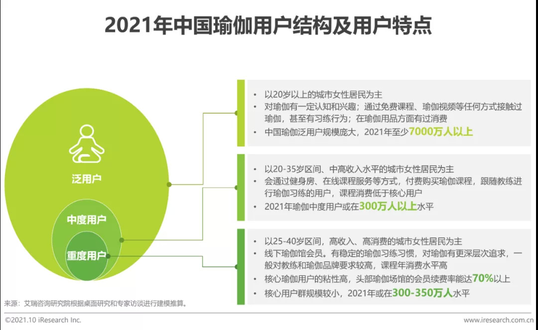 长期以来,中国瑜伽行业主要由高消费力用户群体的增长带动,由于客单价高,瑜伽至今仍然算是相对小众的高端服务。艾瑞研究认为,2021年中国专业瑜伽场馆的重度核心用户,预计在300-350万人水平,用户规模较小但粘性很高,头部瑜伽品牌的会员续费率甚至可以达到70%;预计通过健身房、在线课程服务等方式进行稳定瑜伽习练的用户也仅300万水平。与此同时,中国存在一个庞大的瑜伽泛用户群体,虽然没有购买付费课程,但他们对瑜伽有基本认知,购买过瑜伽用品,通过各种方式接触甚至习练过瑜伽。因此,中国瑜伽行业未来用户拓展空间广阔。