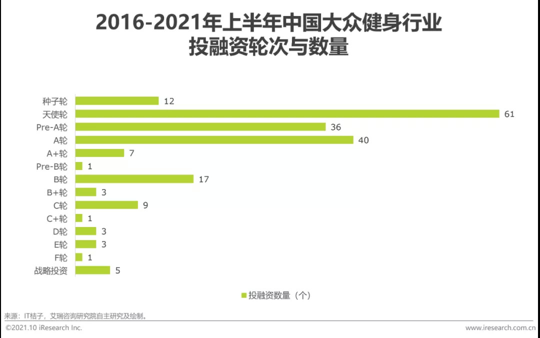 数据显示,2016-2021年我国大众健身行业的融资总规模已接近150亿元。虽然赛道融资笔数逐年减少,加之受疫情影响,2019、2020年融资规模出现较大幅度回落,但2021年后,资本对大众健身赛道的关注度出现明显提升,平均单笔融资金额再创新高。2021年1月,运动科技公司Keep宣布完成3.6亿美元F轮融资,为近六年来领域内最大单笔融资。从融资轮次来看,大众健身行业近七成融资集中在天使轮、Pre-A轮和A轮,均为融资初期,这也意味着我国大众健身行业目前仍处于快速发展阶段,市场正待被激活。