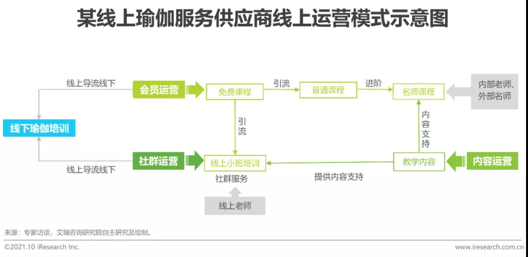 相较于传统的线下瑜伽馆,线上瑜伽服务供应商凭借丰富的资源优势,更易打通用户、内容、渠道等多个环节,从而构建相对完整的运营链条,对用户需求实现精准覆盖。线上瑜伽平台的运营链条,涉及会员运营、内容运营、社群运营、电商、广告等多个板块。会员运营可进一步细分为针对初级会员收取的包年会员费(根据会员不同消费需求,提供不同时效的会员包)与针对进阶会员收取的增值课时费两部分,产品类型均以视频课程为主;内容运营主要指通过与视频网站、内容渠道方等合作教学内容的分发,一方面可以实现跨平台引流;另一方面可以加速内容变现;社群运营主要依托短期训练营的形式,在培训周期内为学员提供线上的视频培训课程、线上老师答疑、课程提醒、饮食建议等相关社群服务,以此增强用户粘性。电商及广告运营则聚焦资源整合,打造品牌效应,从而扩大用户的辐射范围。线下方面,有瑜伽服务供应商会尝试向线下瑜伽场馆服务拓展,将线上用户导流至线下。