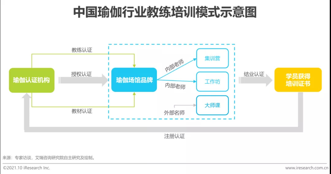 艾瑞预计2021年中国瑜伽教练从业者规模将超30万,数量已趋于饱和。瑜伽行业的流派体系纷繁复杂,因此业界对教练的资质水平缺乏统一的评判标准,不同标准间的差异非常大,教练的培训路径与职业发展路径也呈阶梯式分布。