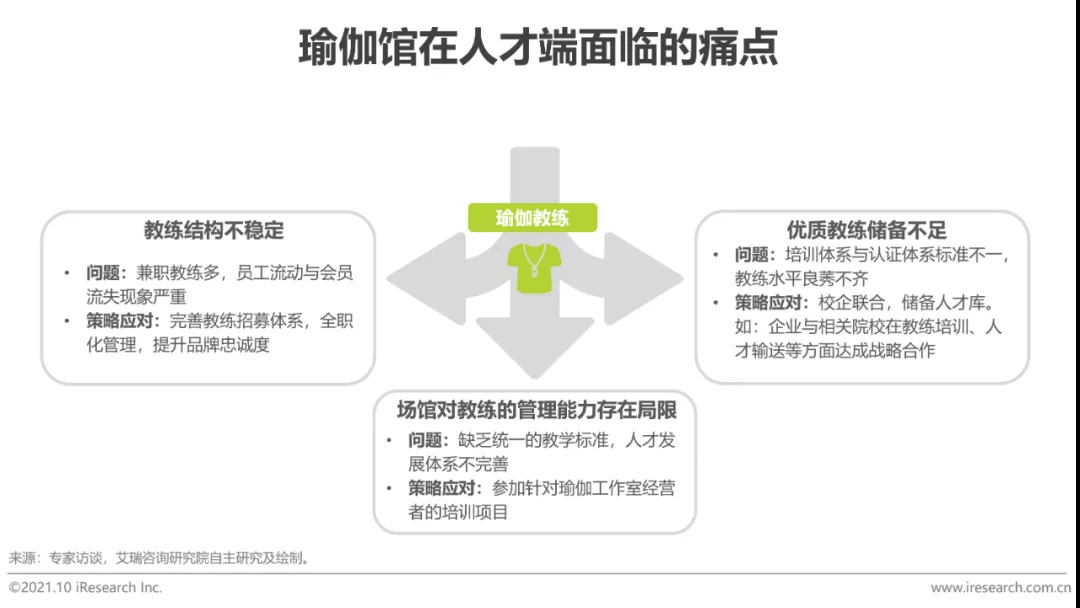 整体来看,瑜伽馆在人才端面临的发展困境主要体现在教练结构不稳定、教练专业度不足以及场馆对教练的管理能力存在局限三个方面。首先,教练结构不稳定。由于大中型瑜伽馆的教练多为兼职,人员流动自由度高,同时也会出现全职明星教练在积累了大量会员资源后选择自立门户的情况,由此导致瑜伽馆的员工流动与会员流失现象时有发生。其次,教练专业度不足。如前文所述,虽然市场中的瑜伽教练数量已趋于饱和,但行业内针对教练的培训体系与认证体系标准不一,导致教练水平良莠不齐,优质教练数量占比较低。最后,场馆对教练的管理能力存在局限。瑜伽馆的创办者多为瑜伽教练出身,该类人群通常具备较强的专业能力,但在商业运作以及管理上存在一定局限性,很多瑜伽馆因此缺乏科学和体系化的人才管理、培养和晋升体系。