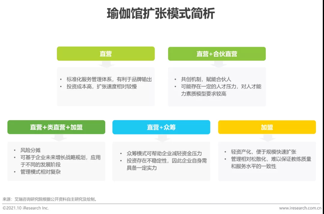 如前文所述,虽然近几年一线城市的瑜伽馆数量涨幅迅猛,但国内瑜伽行业发展极不平衡,具有绝对领先地位的超大规模直营品牌尚未出现,市面上的瑜伽培训产品鱼龙混杂,大众对瑜伽缺乏正确的认知且判断力不足,市场正待被规范化。对二三线城市而言,瑜伽馆的一次性投入成本相比一线城市较低、选址范围相对更广,未来品牌可以通过直营与加盟等组合扩张模式抢占下沉市场,快速布局扩张,率先占得市场先机,实现规模化运营。